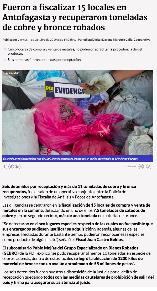 PDI recupera 10 toneladas de cobre robado - (El Mercurio de Antofagasta)