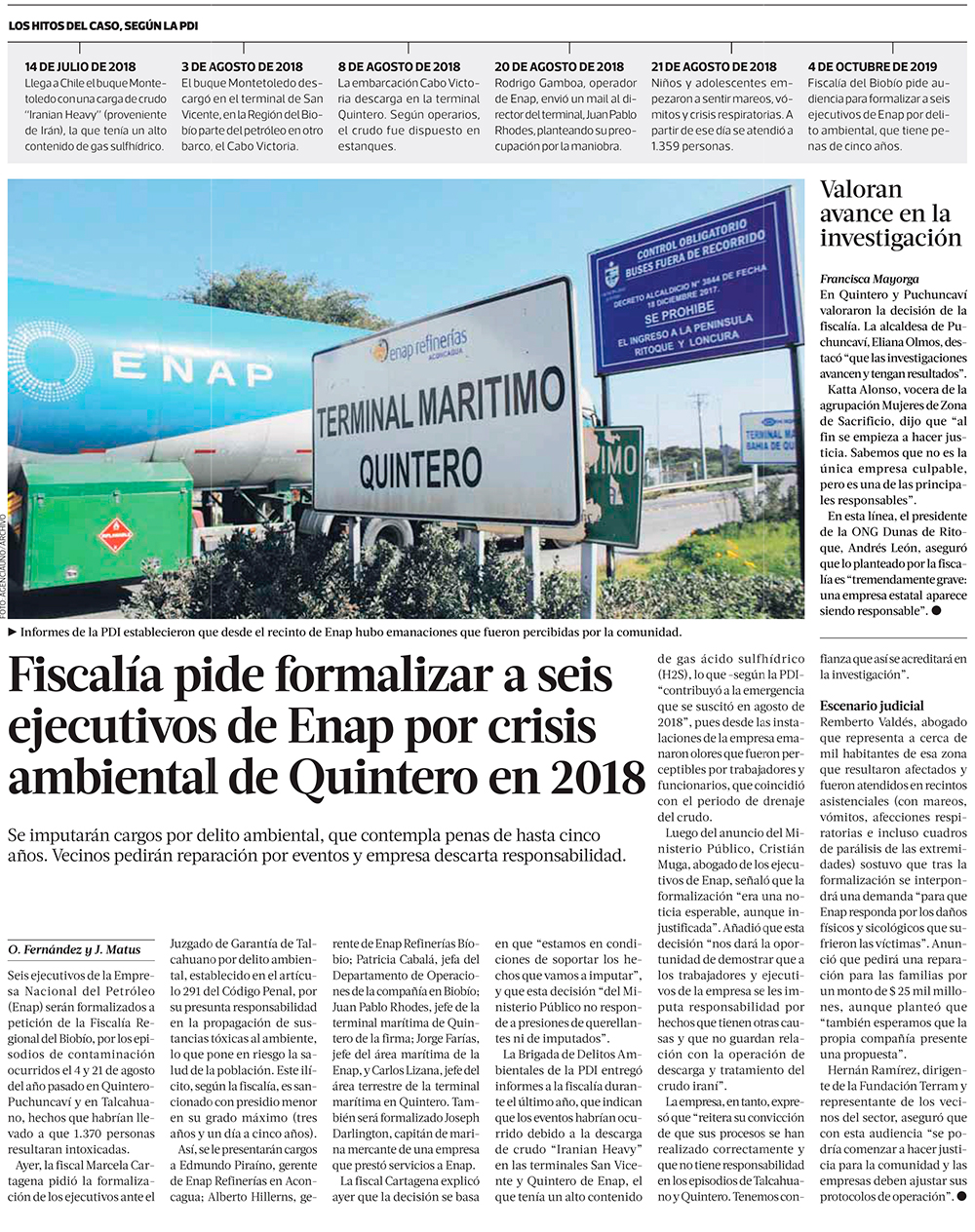 Ministerio Público pide la formalización de 6 ejecutivos de Enap por intoxicaciones masivas - (El Mercurio de Valparaíso)
