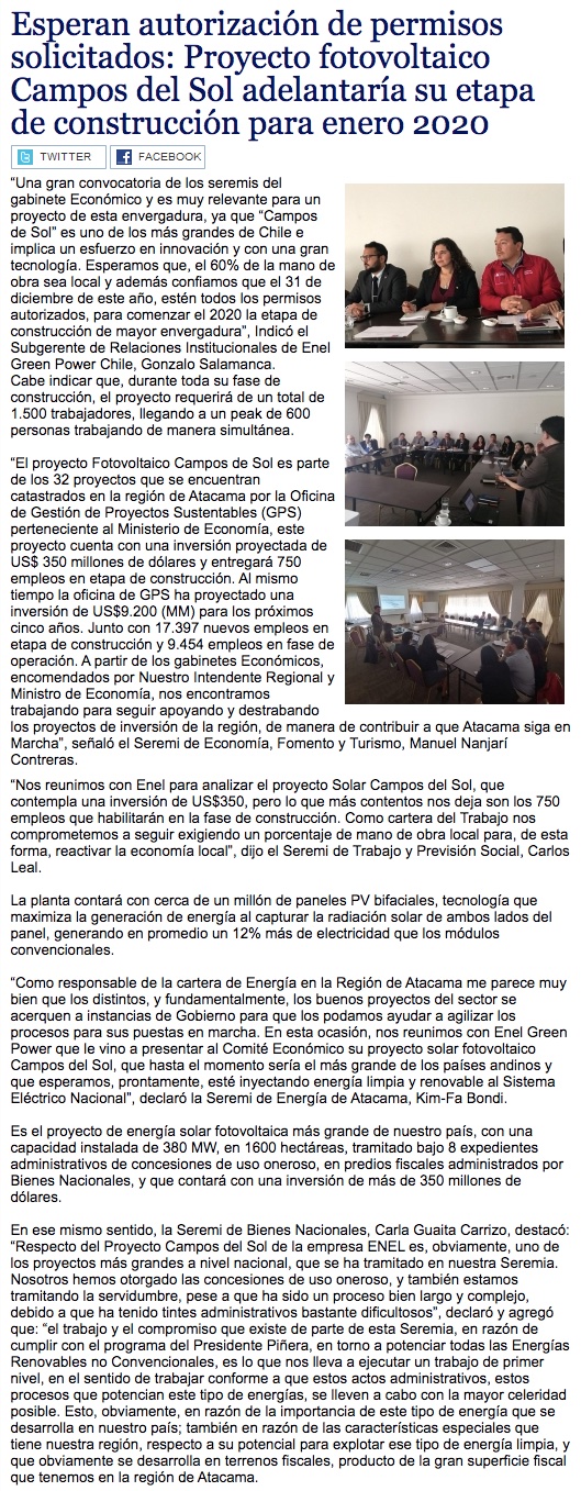 Proyecto fotovoltaico comenzará su construcción en 2020 - (El Diario de Atacama)