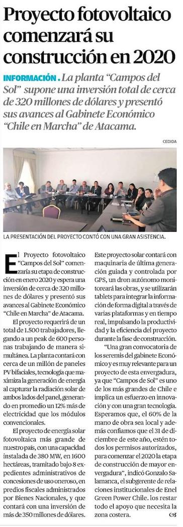 Proyecto fotovoltaico Campos del Sol adelantaría su etapa de construcción para enero 2020 - (El Chañarcillo)