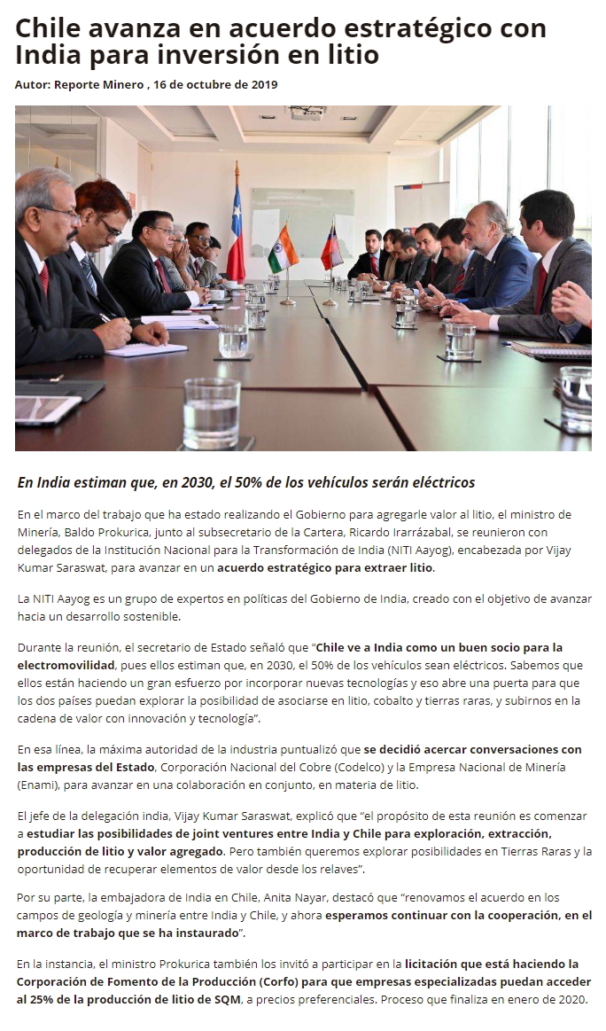 Chile e India estudian joint ventures para agregación de valor en litio - (mch.cl)