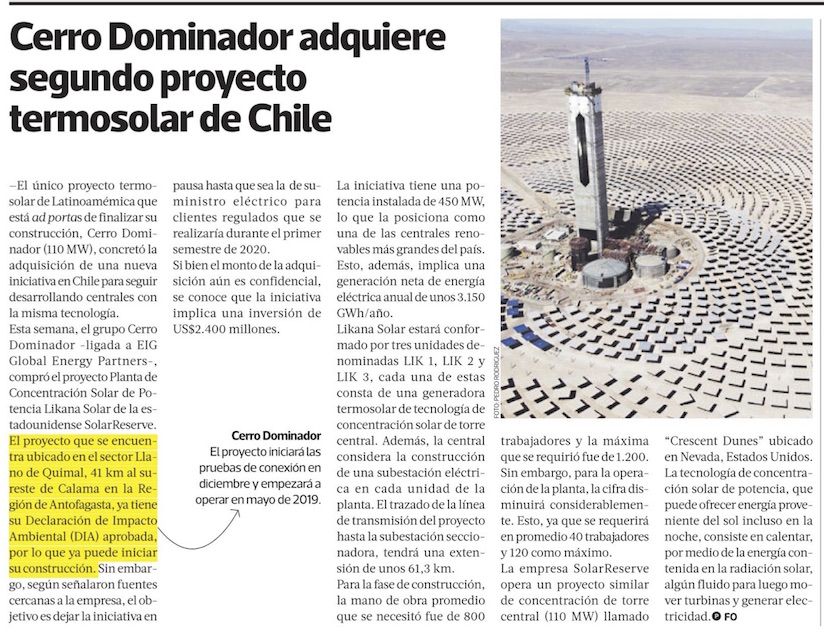 Cerro Dominador evalúa nuevo proyecto de concentración solar en la región - (El Mercurio de Antofagasta)