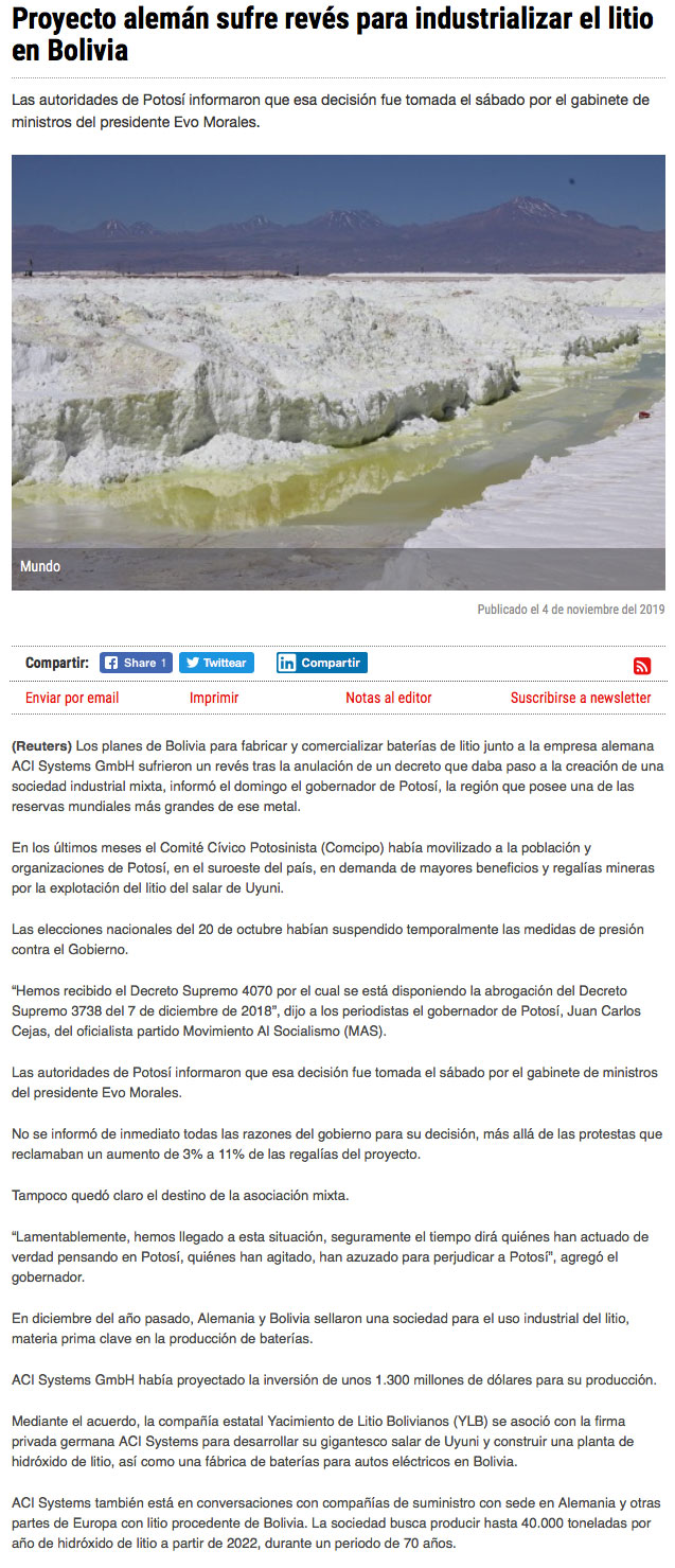 Bolivia deroga decreto que creaba una empresa mixta de litio con la firma alemana ACI Systems - (americaeconomia online)