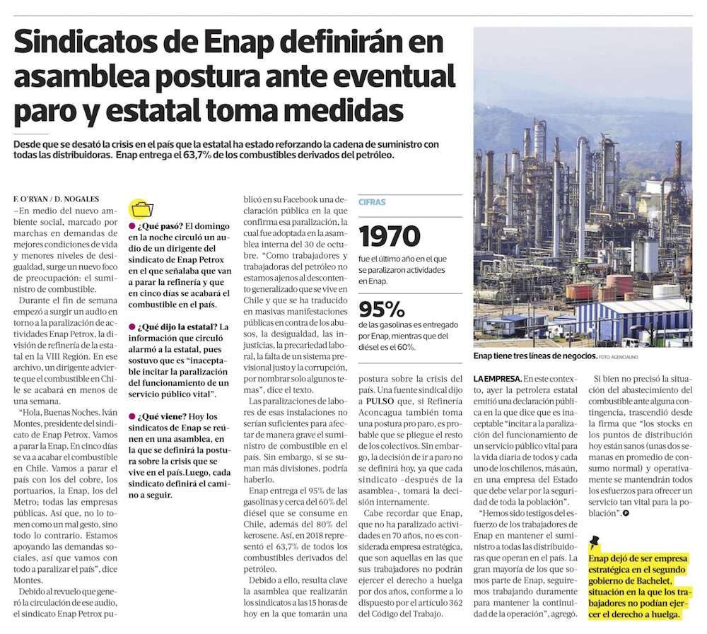 Sindicatos de ENAP y otras organizaciones definen hoy paro nacional - (Diario Financiero)