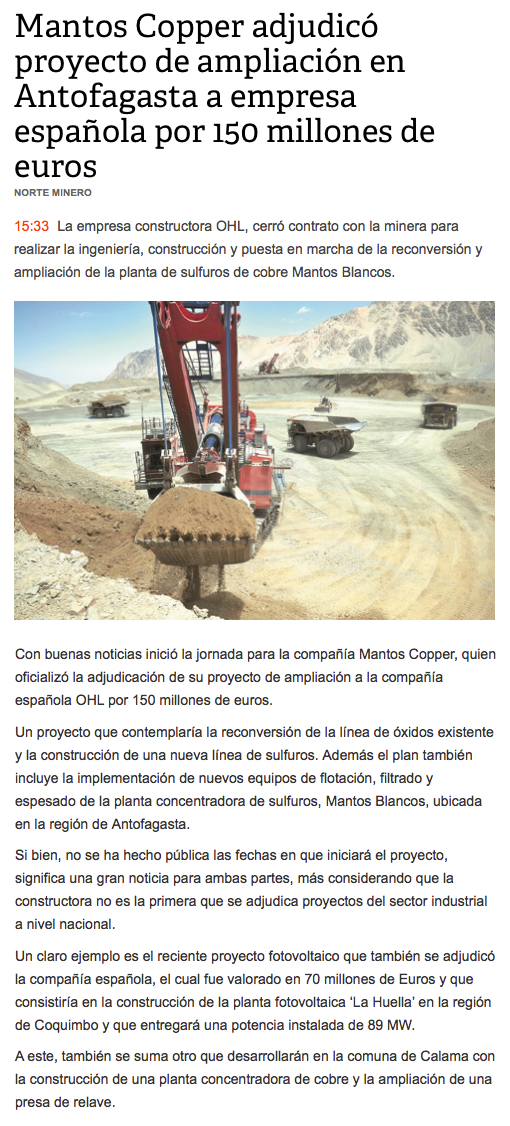 Mantos Copper adjudica a española OHL proyecto por US$166 millones en Mantos Blancos - (mch.cl)
