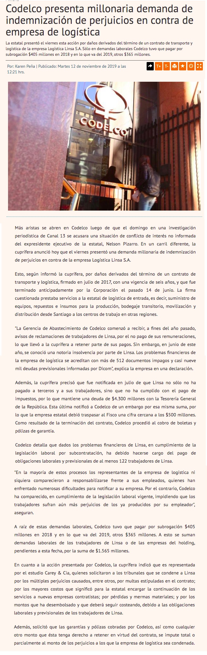 Codelco presenta millonaria demanda contra empresa Linsa por perjuicios económicos - (norteminero online)