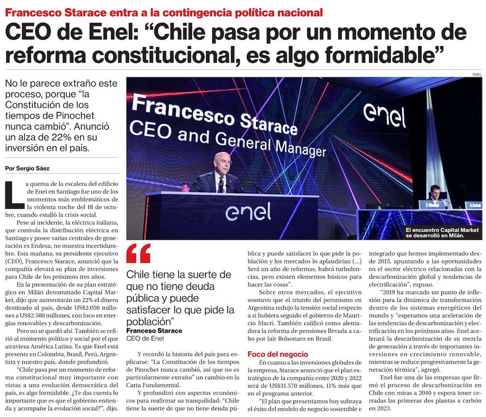 Enel eleva inversión en Chile pese a crisis social y valora proceso constitucional - (Diario Financiero)