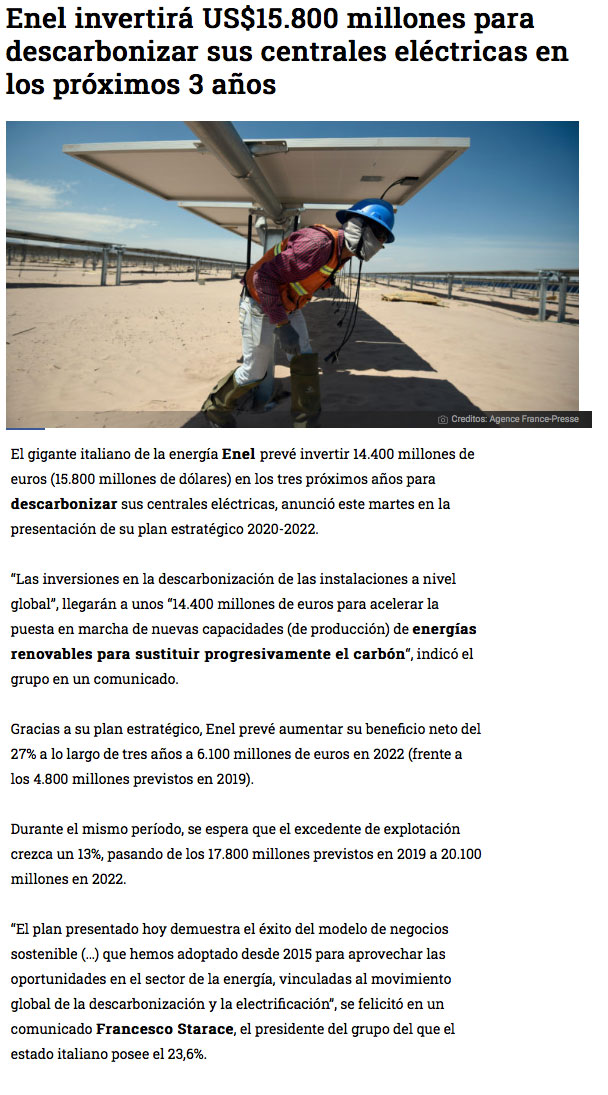 Enel invertirá US$15.800M para descarbonizar centrales eléctricas a nivel global - (americaeconomia online)