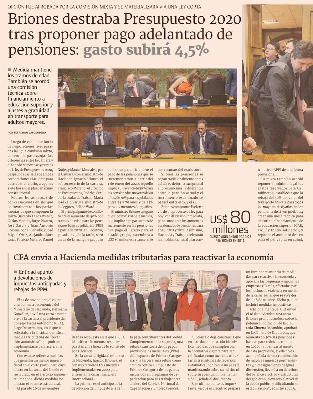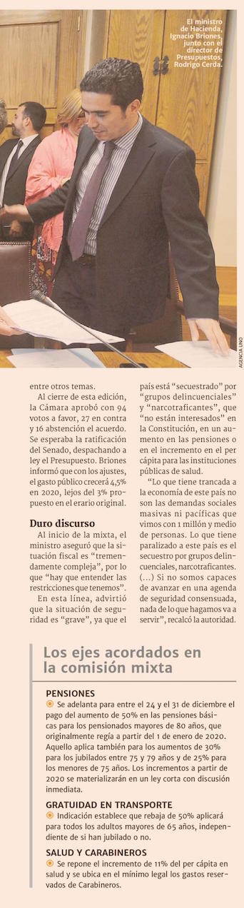 Congreso aprueba Presupuesto 2020 y Gobierno acuerda ley corta para subir pensiones solidarias desde diciembre - (El Mercurio de Santiago)