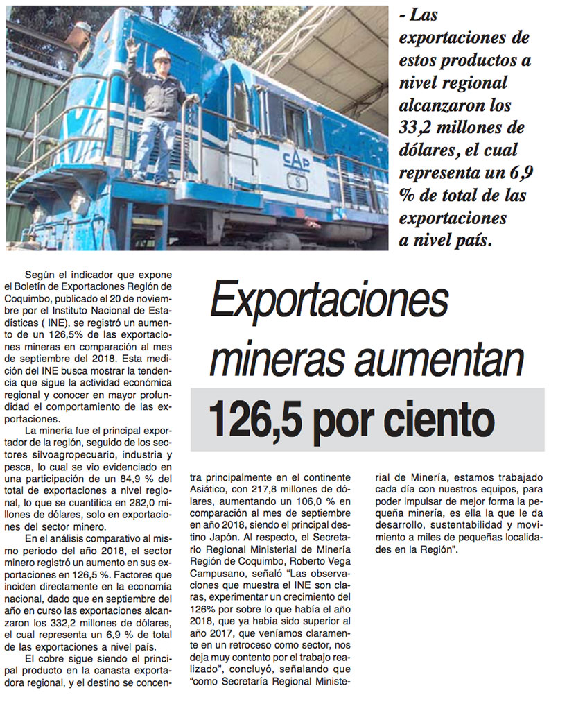Crisis social no golpea a la minería regional: en 126% aumentaron exportaciones - (El Día)