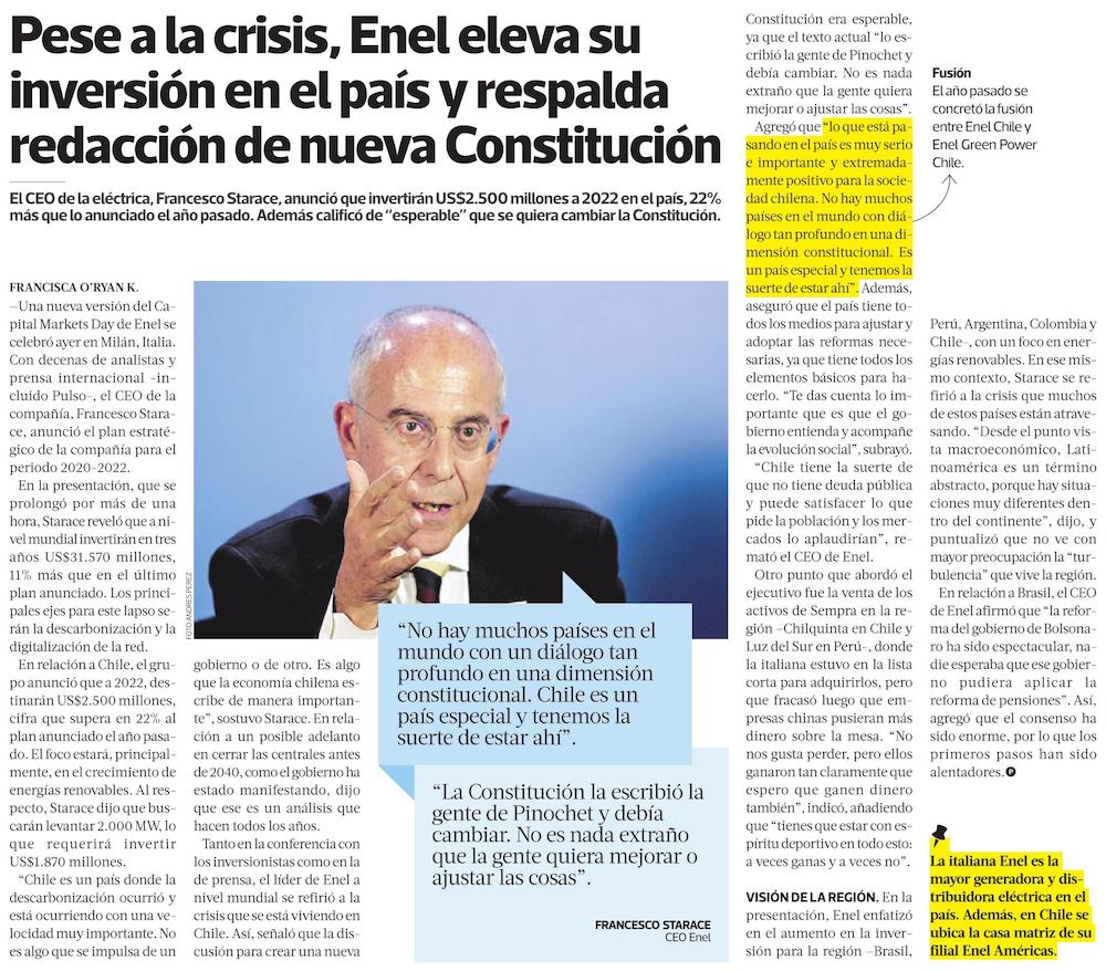 Enel eleva inversión en Chile pese a crisis social y valora proceso constitucional - (Diario Financiero)