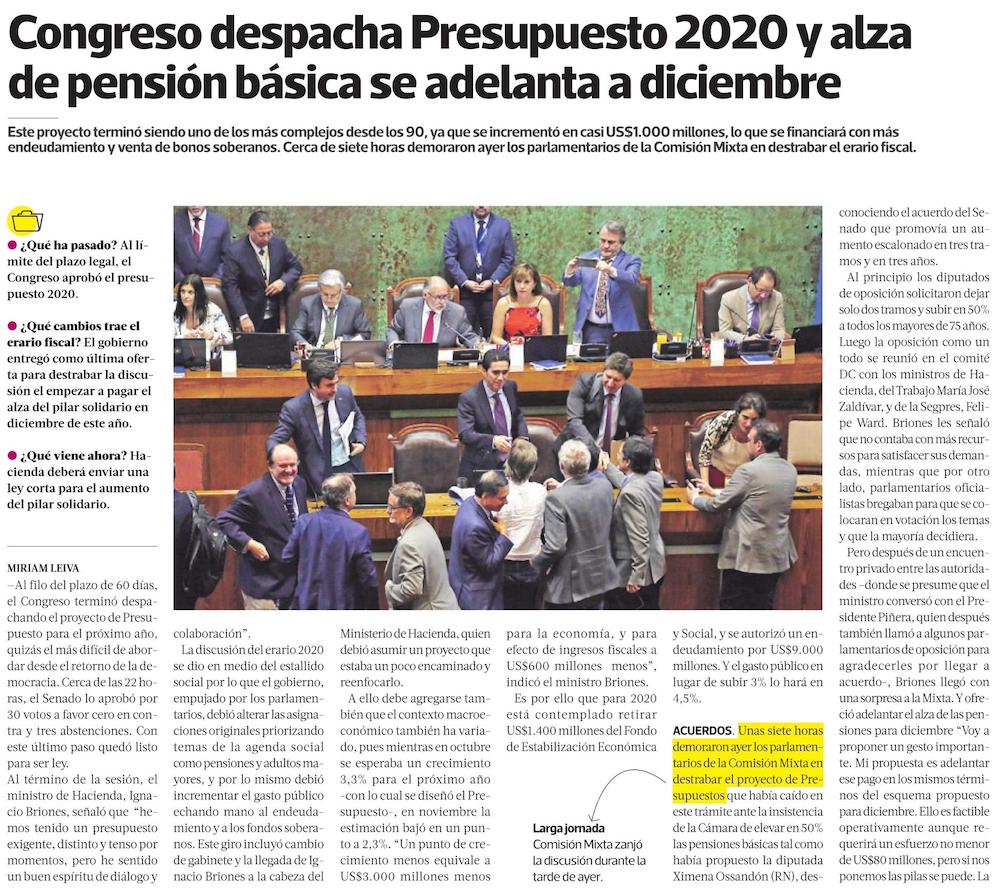 Congreso aprueba Presupuesto 2020 y Gobierno acuerda ley corta para subir pensiones solidarias desde diciembre - (El Mercurio de Santiago)