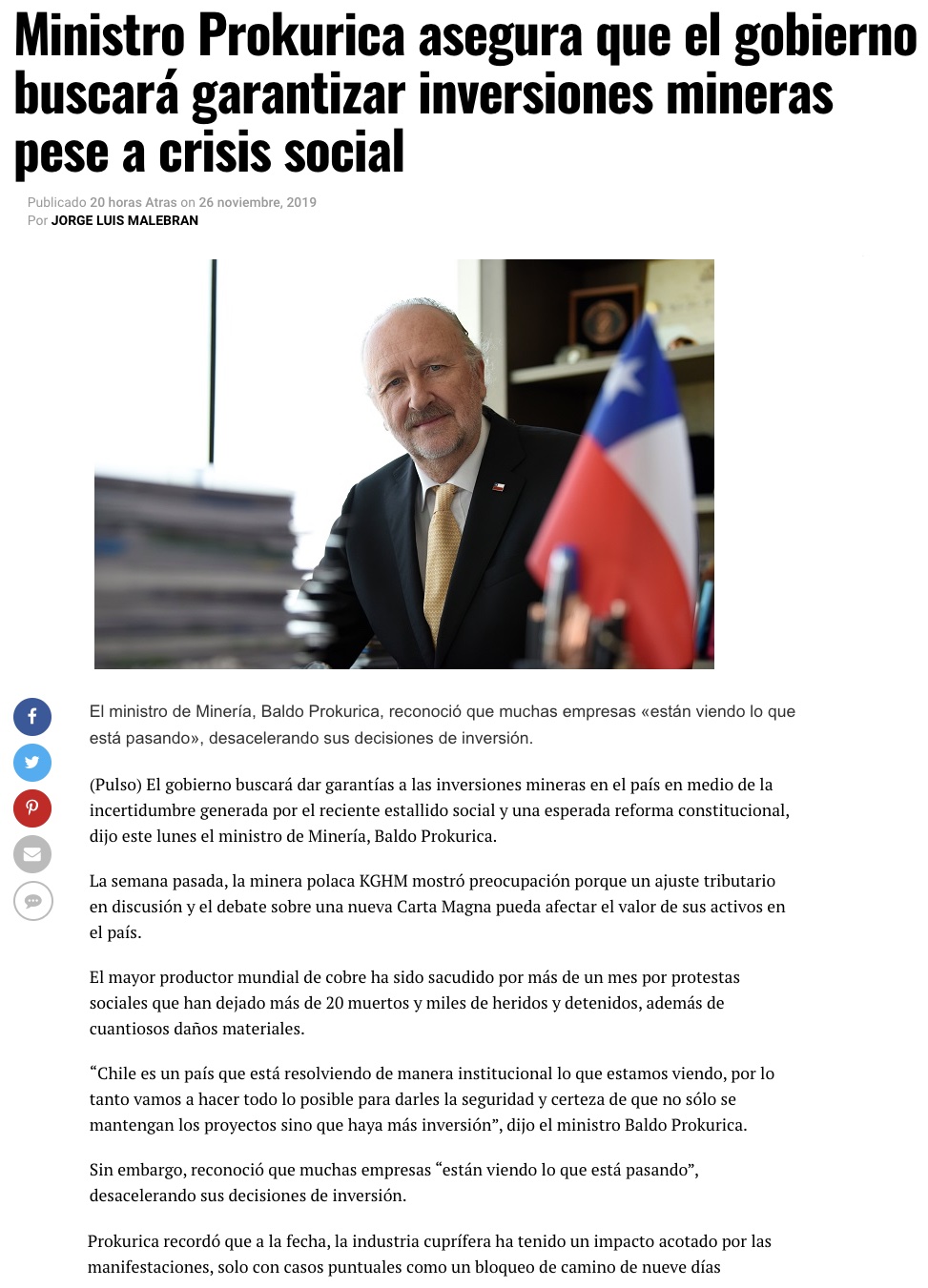 Prokurica le respondió a empresario de EEUU que dijo que Chile es un “lugar terrible” para invertir - (laNacion)