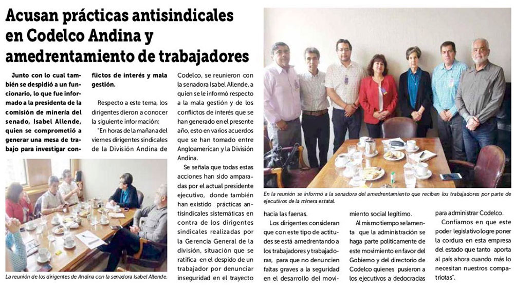 Trabajadores de Codelco Andina acusan persecución tras querella criminal interpuesta por la empresa - (biobiochile online)