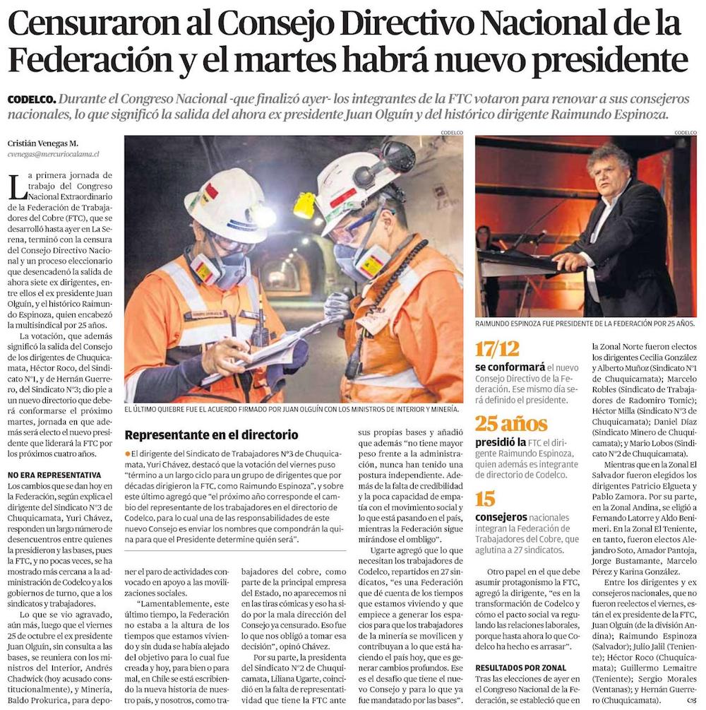 Facción más radical gana terreno en Consejo Nacional de la FTC y salen dirigentes históricos de Codelco - (El Mercurio de Santiago)