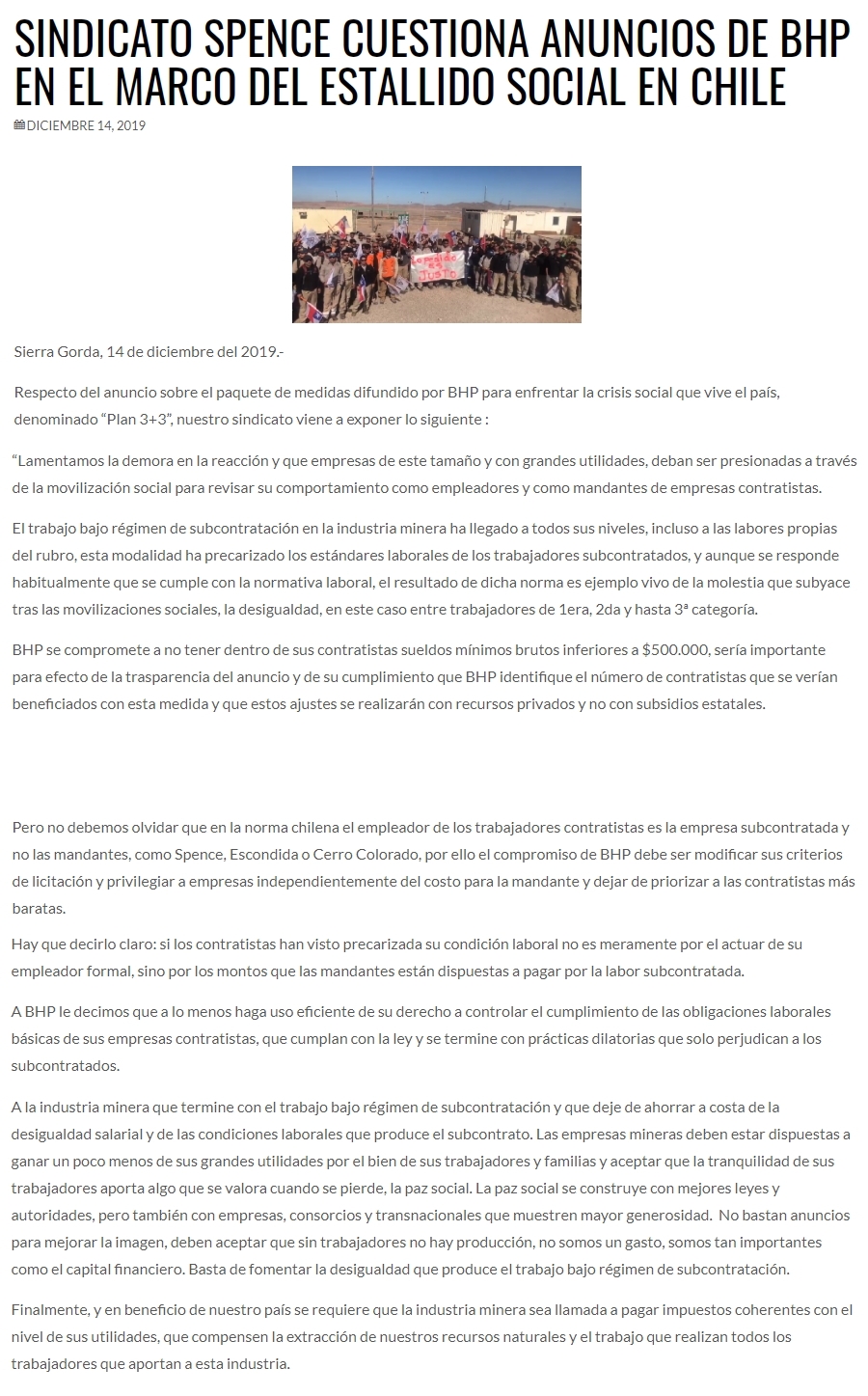 Sindicato Spence cuestiona anuncios de BHP en el marco del estallido social en Chile - (regionalista.cl)