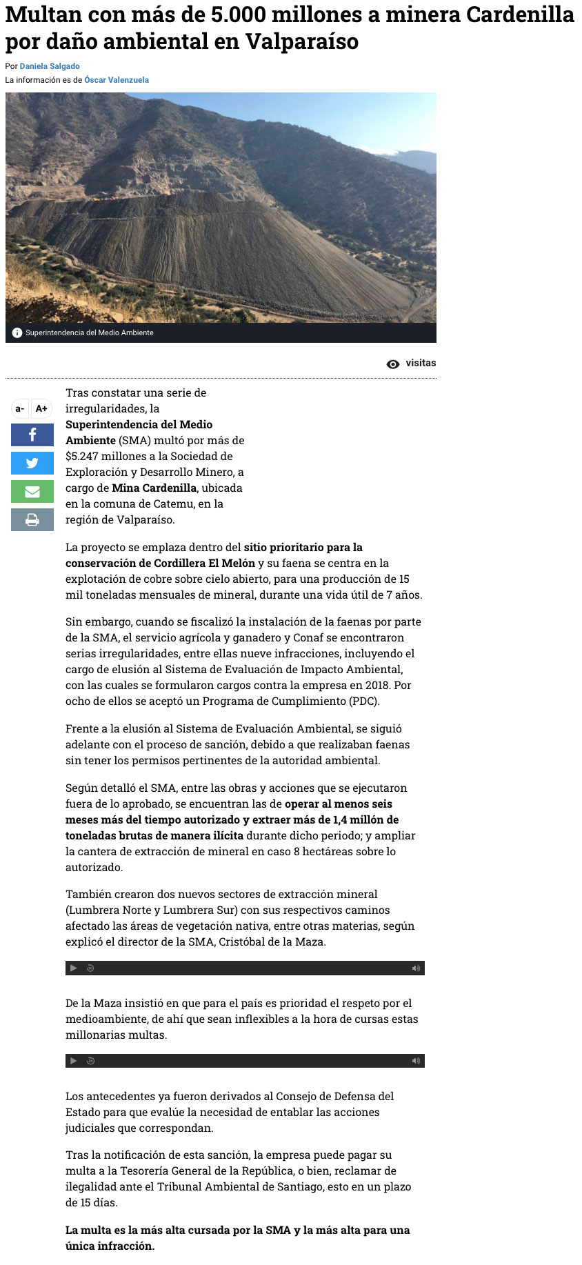 Mina Cardenilla es multada por daño ambiental: deberá pagar más de $5 mil 200 millones - (radio.uchile online)