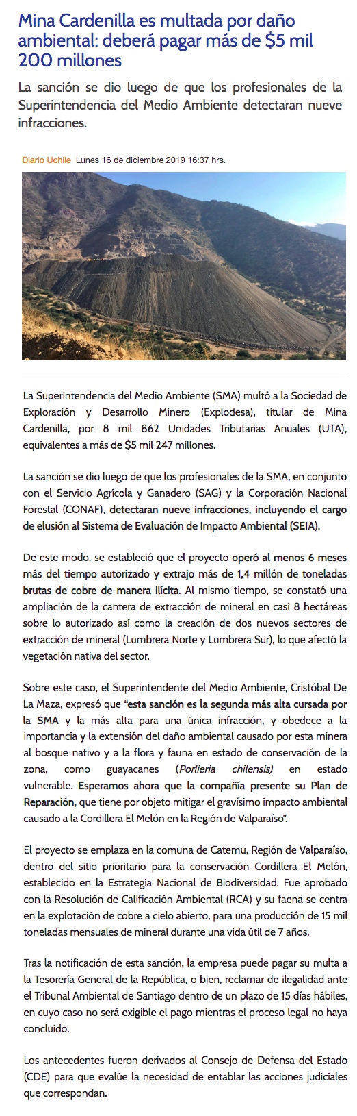 SMA aplica muta de $5.247 millones a Mina Cardenilla - (Pulso)
