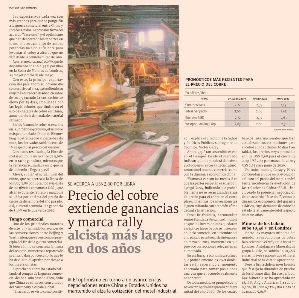 Cobre sube 9 días seguidos y escala a US$2,8 la libra - (El Mercurio de Santiago)