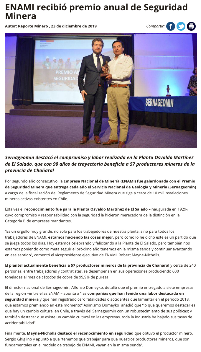 ENAMI recibe premio anual de Seguridad Minera - (portalminero)
