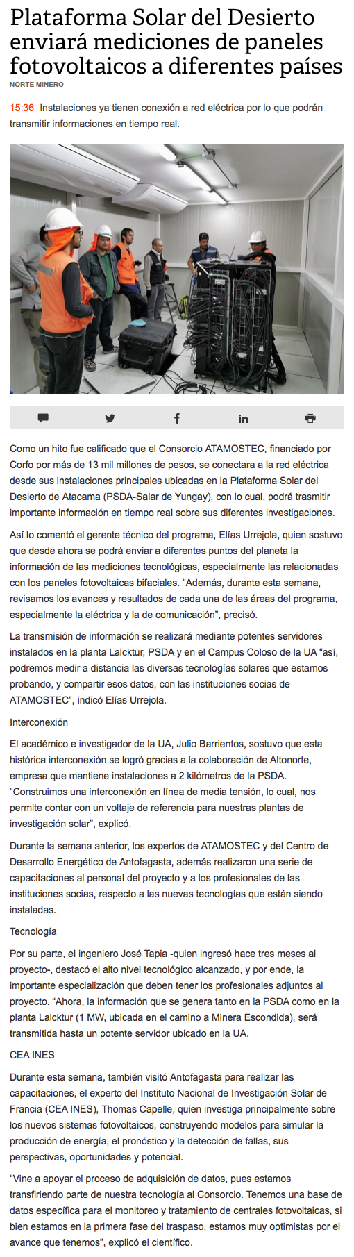Plataforma solar transmitirá información en tiempo real - (El Mercurio de Antofagasta)