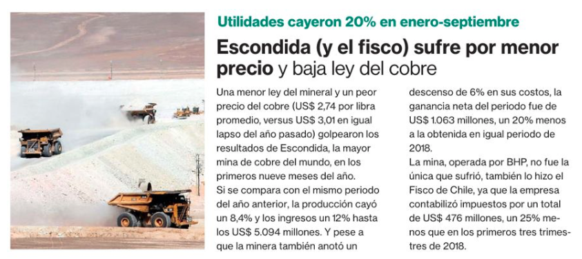 Escondida reporta menor producción de cobre y ganancias anotan dura caída entre enero y septiembre - (Pulso Online)