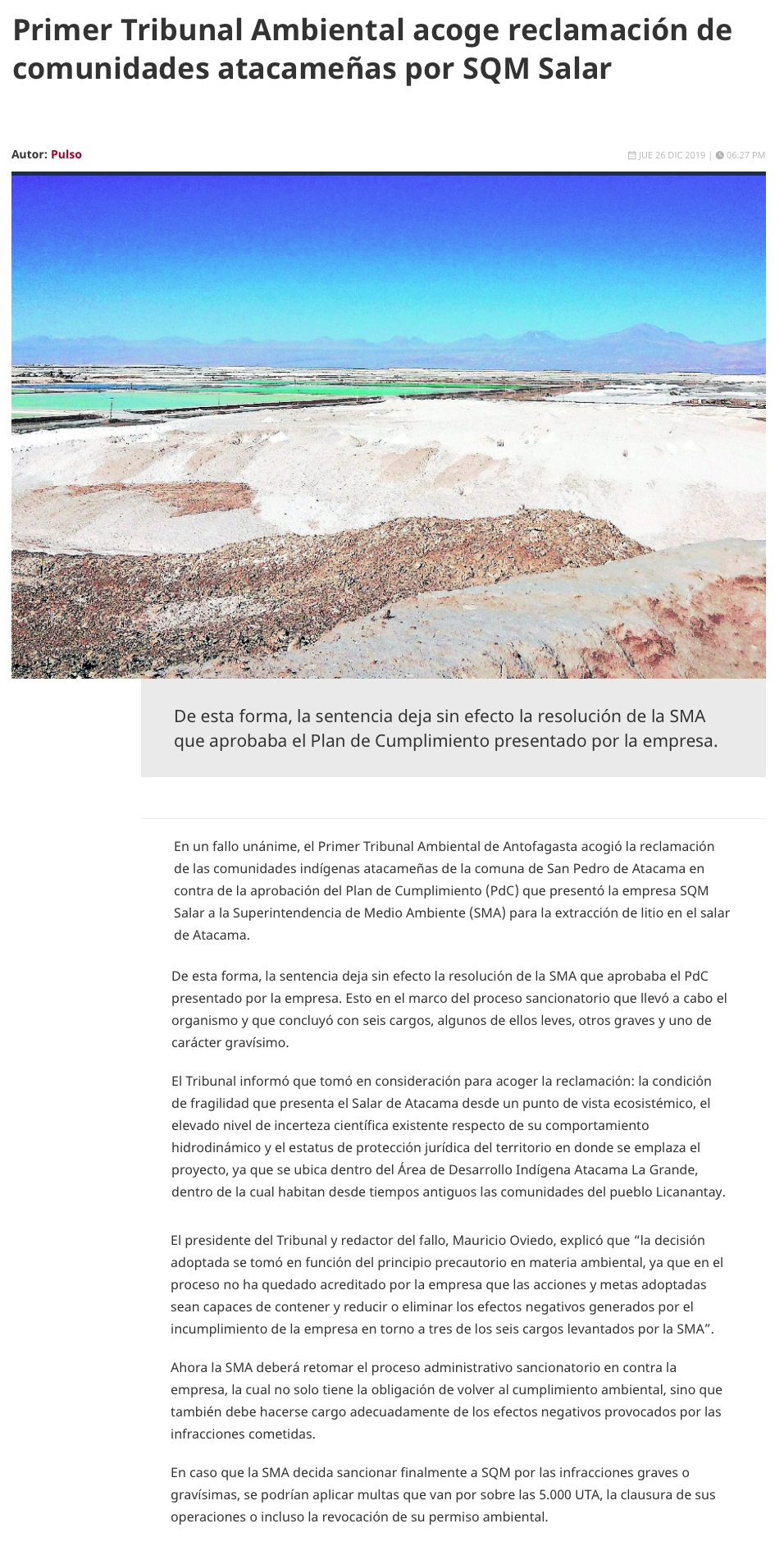 Tribunal Ambiental acoge reclamación de comunidades atacameñas por SQM Salar - (Pulso)