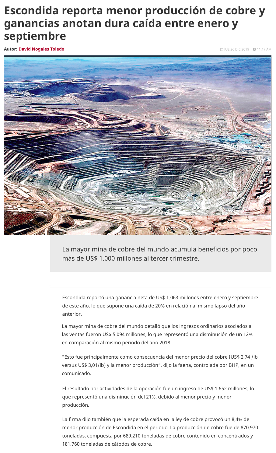 Escondida (y el fisco) sufre por menor precio y baja ley del cobre - (La Segunda)