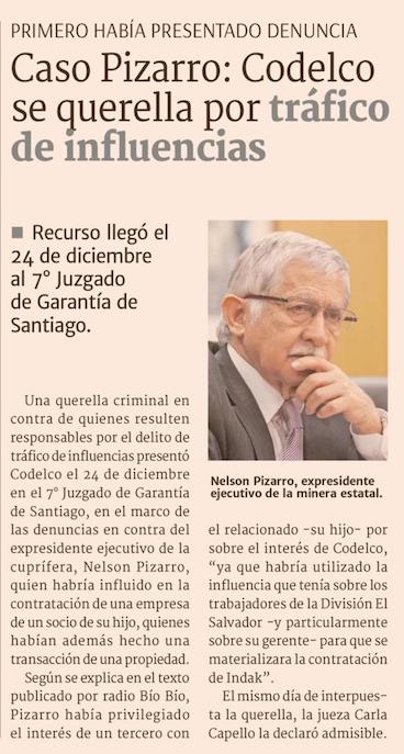 Codelco eleva el tono contra Nelson Pizarro, lo acusa de tráfico de influencias y presenta querella - (Pulso)