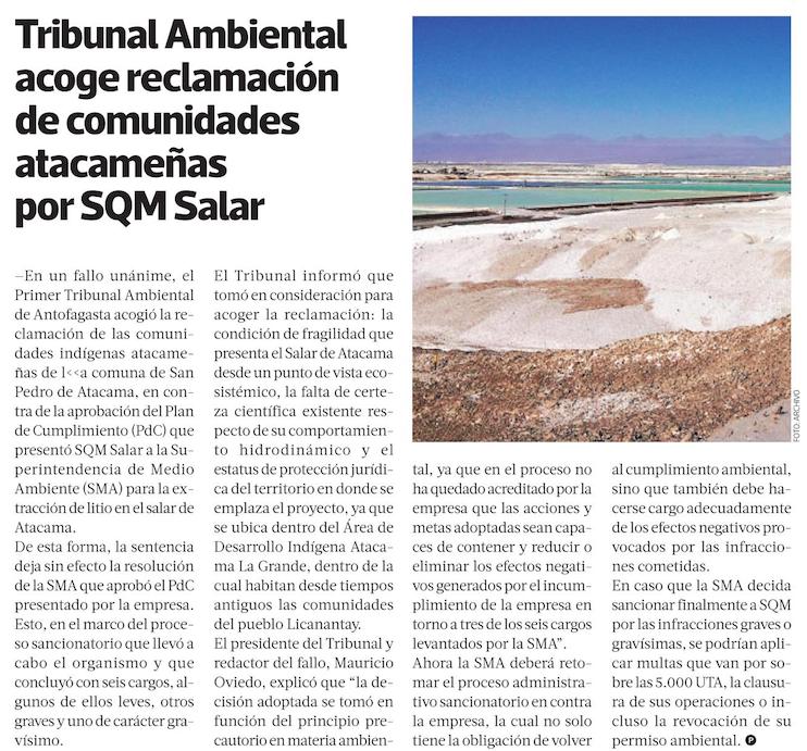 Primer Tribunal Ambiental acoge reclamación de comunidades atacameñas por SQM Salar - (La Tercera Online)