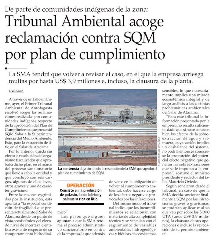 Primer Tribunal Ambiental acoge reclamación de comunidades atacameñas por SQM Salar - (La Tercera Online)