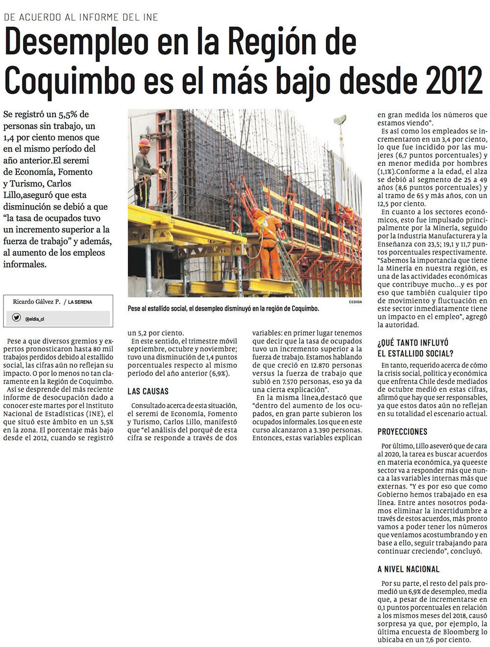Contra todo pronóstico, desempleo en la región durante septiembre, octubre y noviembre bajó a un 5,5% - (La Región)
