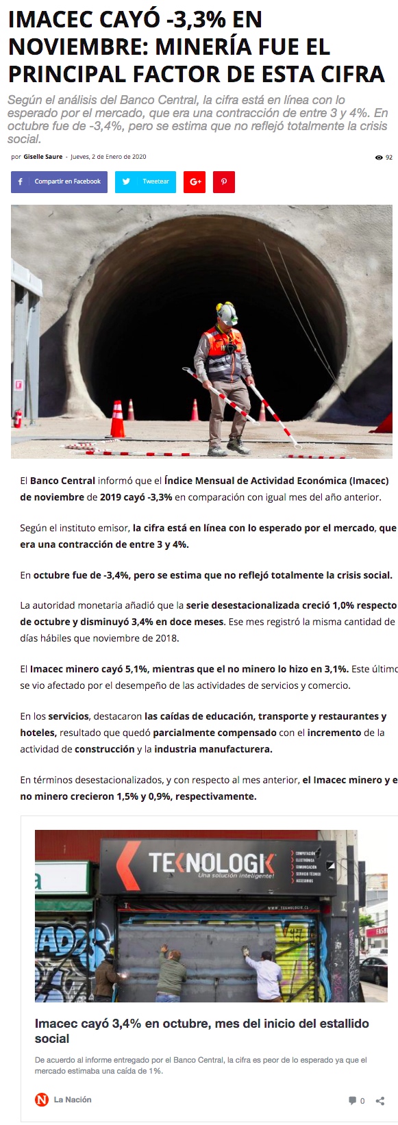 Economía se contrae 3,3% en noviembre y despidos por necesidad de la empresa superan los 90 mil en diciembre - (El Mercurio de Santiago)