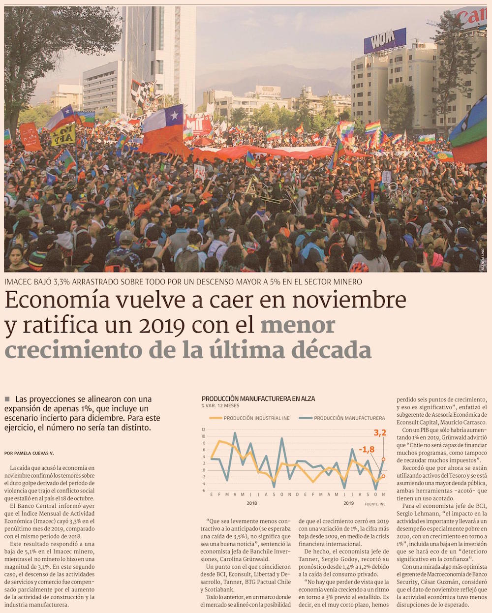 Economía se contrae 3,3% en noviembre y despidos por necesidad de la empresa superan los 90 mil en diciembre - (El Mercurio de Santiago)