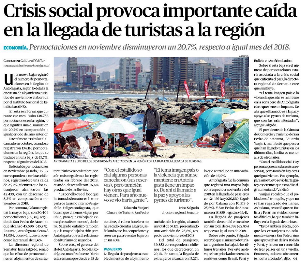 Crisis social provoca importante caída en la llegada de turistas a la región - (El Mercurio de Calama)