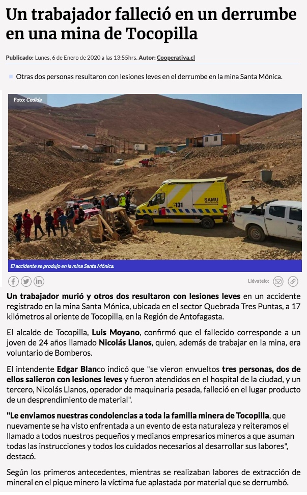 Joven de 24 años falleció en derrumbe de mina en Tocopilla - (El Mercurio de Antofagasta)