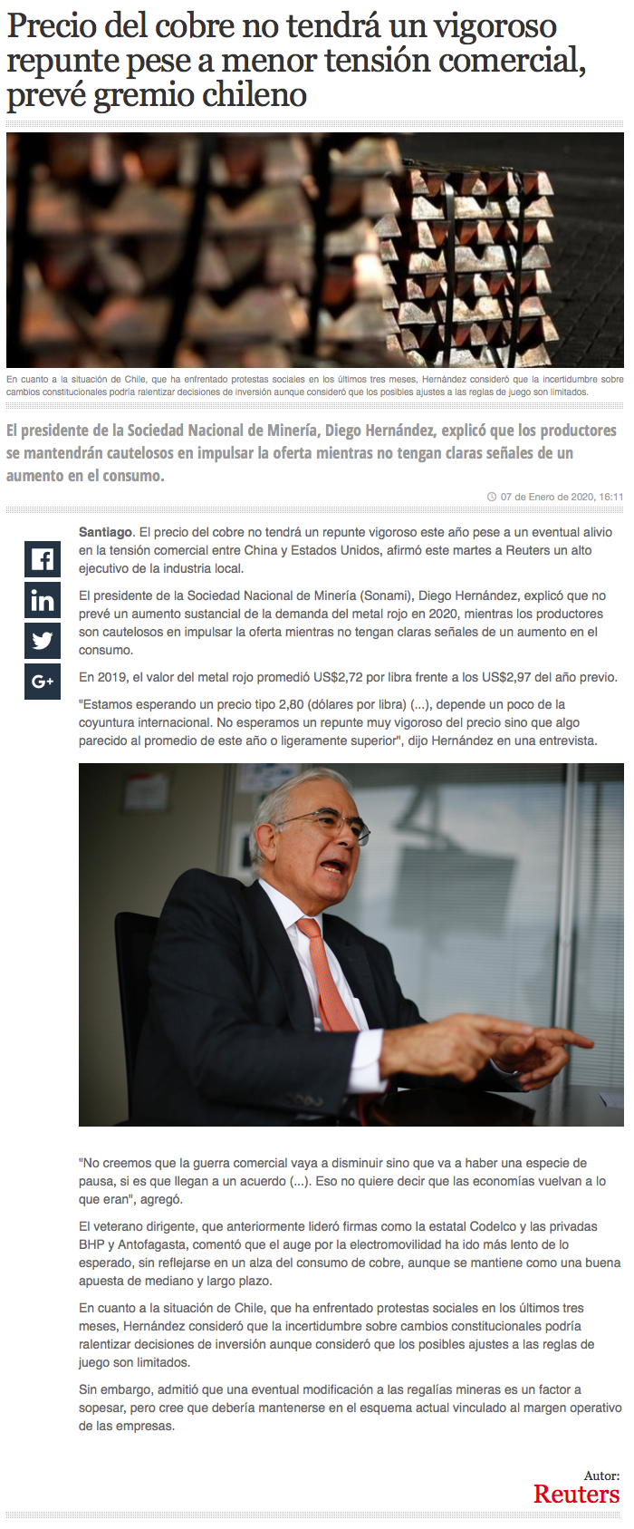 Presidente de Sonami: "Precio del cobre no tendrá vigoroso repunte pese a menor tensión comercial" - (Pulso Online)