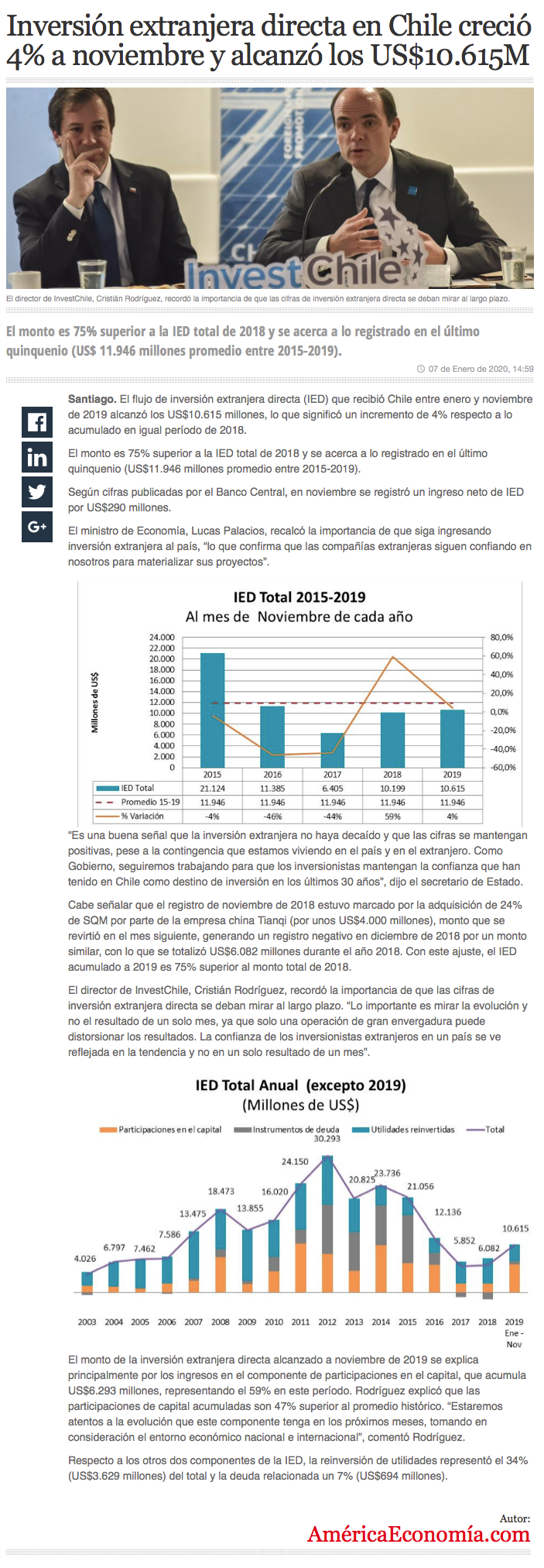 Pese a fuerte caída en noviembre, inversión extranjera anota mayor flujo en tres años - (El Mercurio de Santiago)