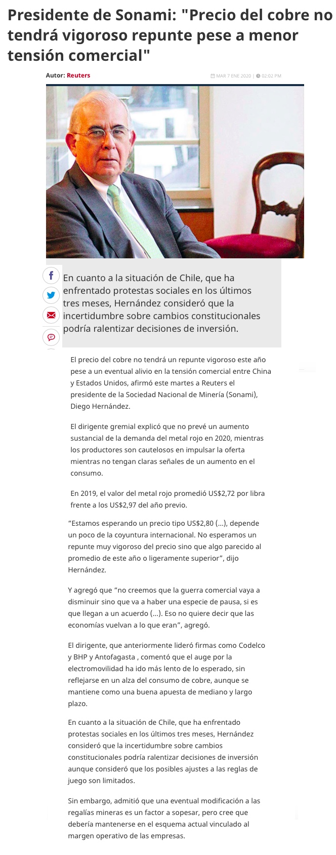 Precio del cobre no tendrá un vigoroso repunte pese a menor tensión comercial, prevé gremio chileno - (americaeconomia online)