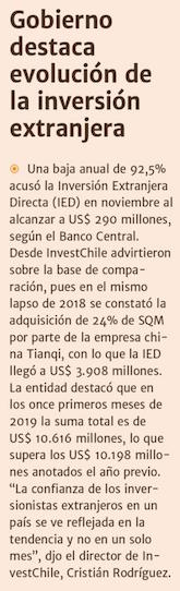Pese a fuerte caída en noviembre, inversión extranjera anota mayor flujo en tres años - (El Mercurio de Santiago)