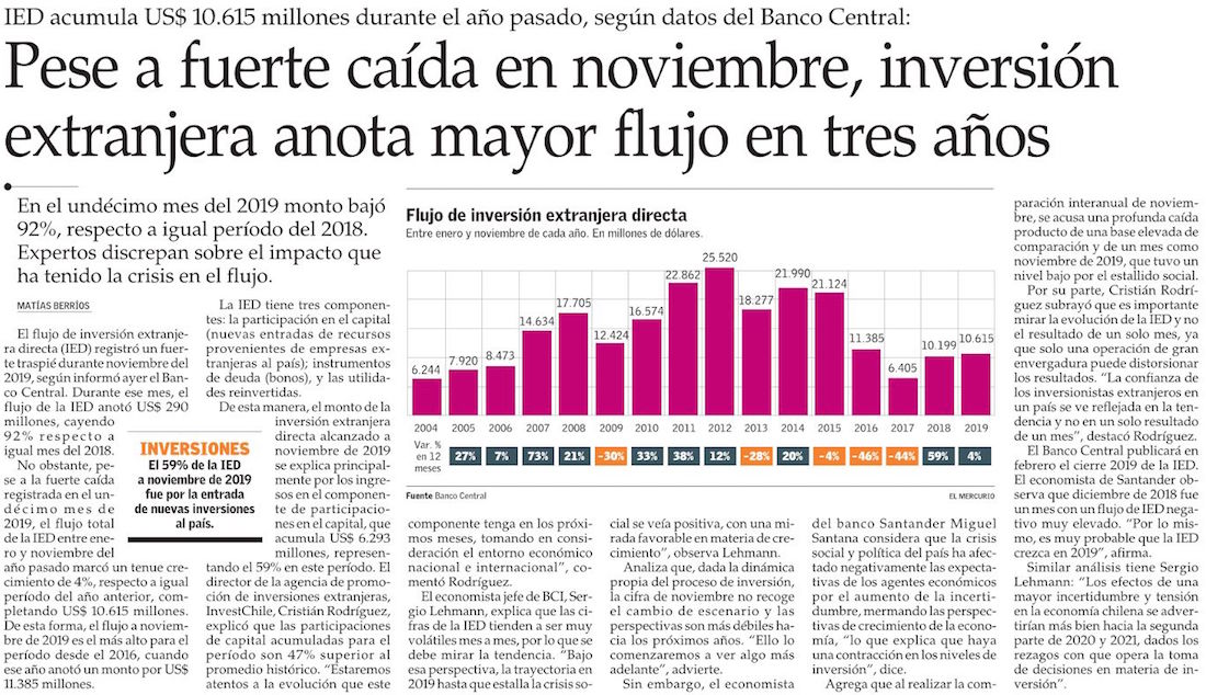 Inversión extranjera directa en Chile creció 4% a noviembre y alcanzó los US$10.615M - (americaeconomia online)