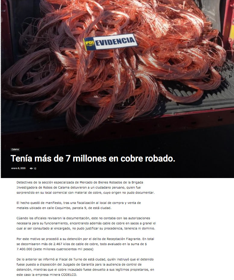 Más de $7 millones en cobre robado escondía comerciante en su parcela - (El Mercurio de Calama)