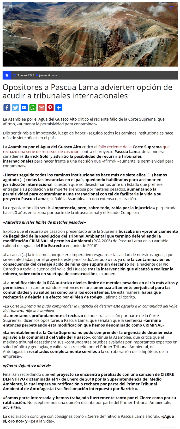Opositores a Pascua Lama advierten opción de acudir a tribunales internacionales - (cooperativa online)