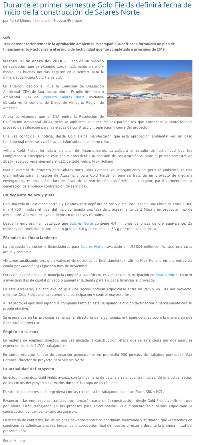Durante el primer semestre Gold Fields definirá fecha de inicio de la construcción de Salares Norte - (Nostálgica Online)