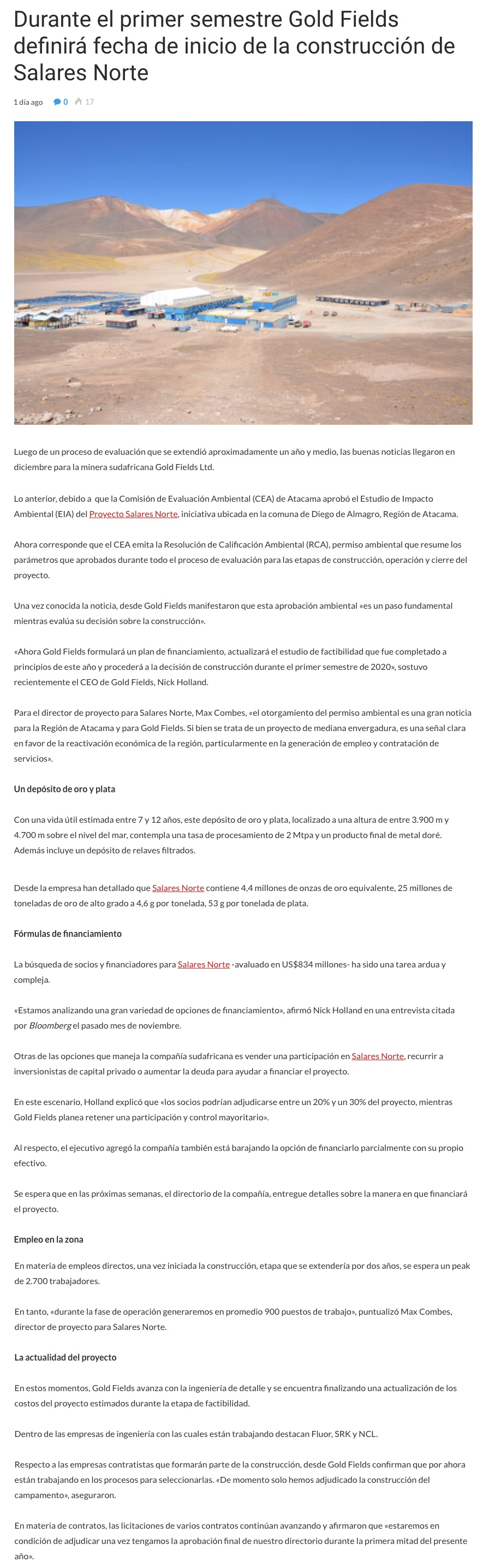 Durante el primer semestre Gold Fields definirá fecha de inicio de la construcción de Salares Norte - (portalminero)