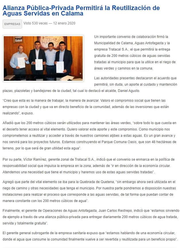 Reutilizarán 200 mil litros de aguas servidas en áreas verdes y caminos - (El Mercurio de Calama)