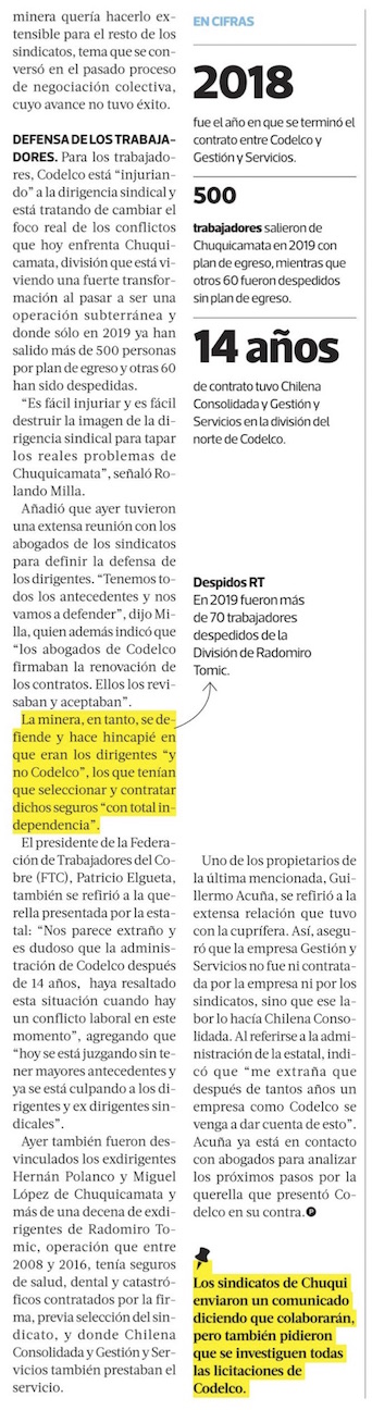 Codelco desvincula a tres trabajadores por caso Seguros y pide desaforar a dirigentes - (El Mercurio de Santiago)