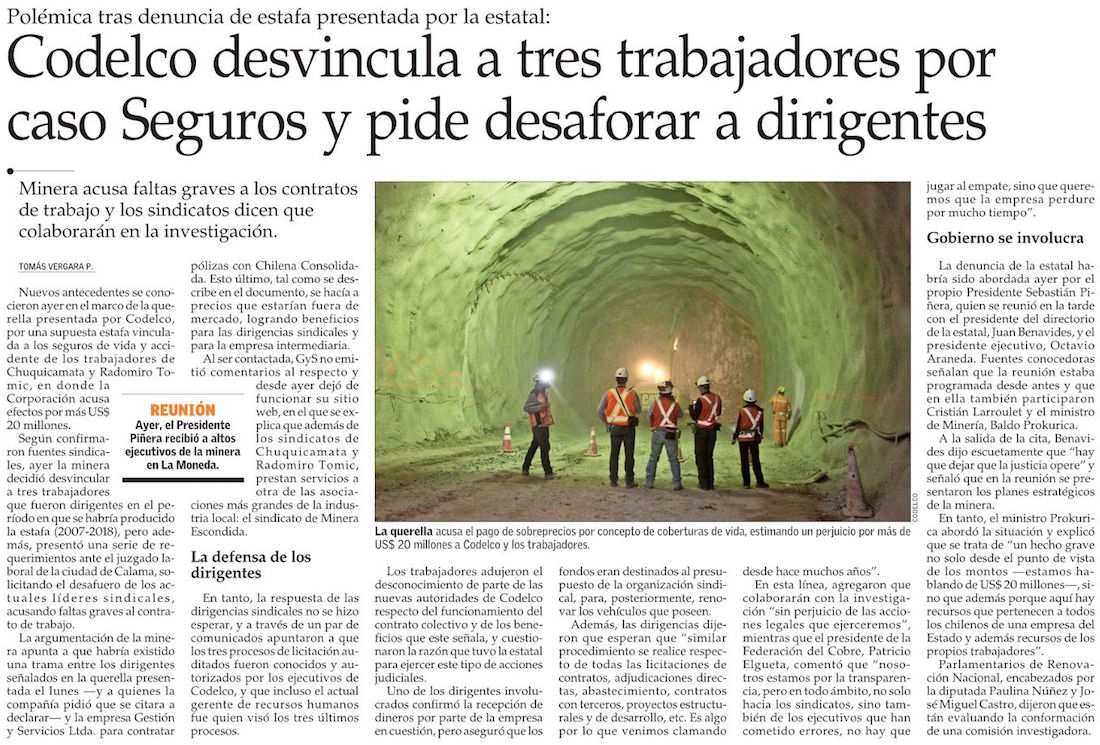 Codelco se querella por estafa contra los dirigentes de Chuqui y pide su desafuero - (El Mercurio de Calama)