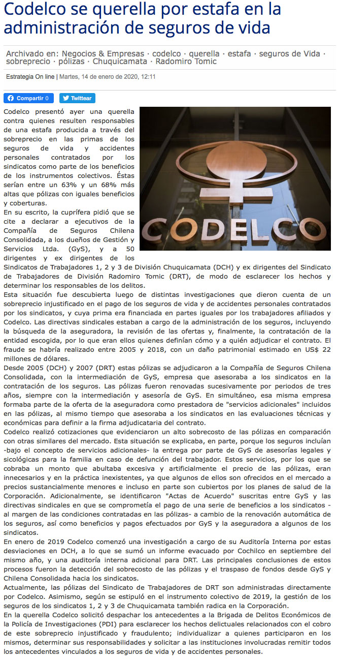 Codelco se querelló por supuesta estafa en el manejo de seguros de vida de trabajadores - (cooperativa online)
