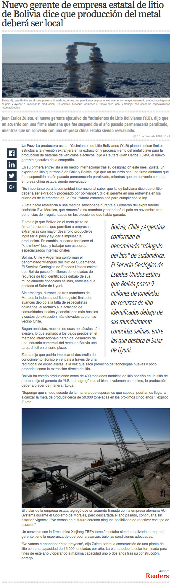 Nuevo gerente ejecutivo de empresa estatal de litio boliviana afirma que producción debe ser local - (Pulso Online)